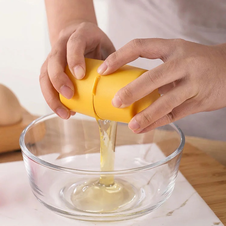 Hur man använder den: Placera äggen i kuben och tryck på metallklämman med fingrarna. Detta kommer att knäcka insidan av äggskalet. Vänd sedan kuben upp och ner, öppna den och häll ut den spruckna äggulan på en tallrik eller i en behållare.