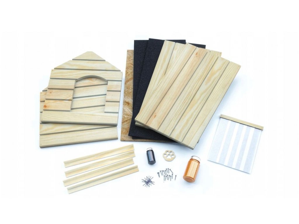 Kennlarna levereras utfällda. Du får kojaväggarnaa tillsammans med en monteringssats med skruvar, en handbok med detaljerade anvisningar och 250 ml träskyddsmedel. Hundkojan är inte belagd, så den måste impregneras med den medföljande färgen.